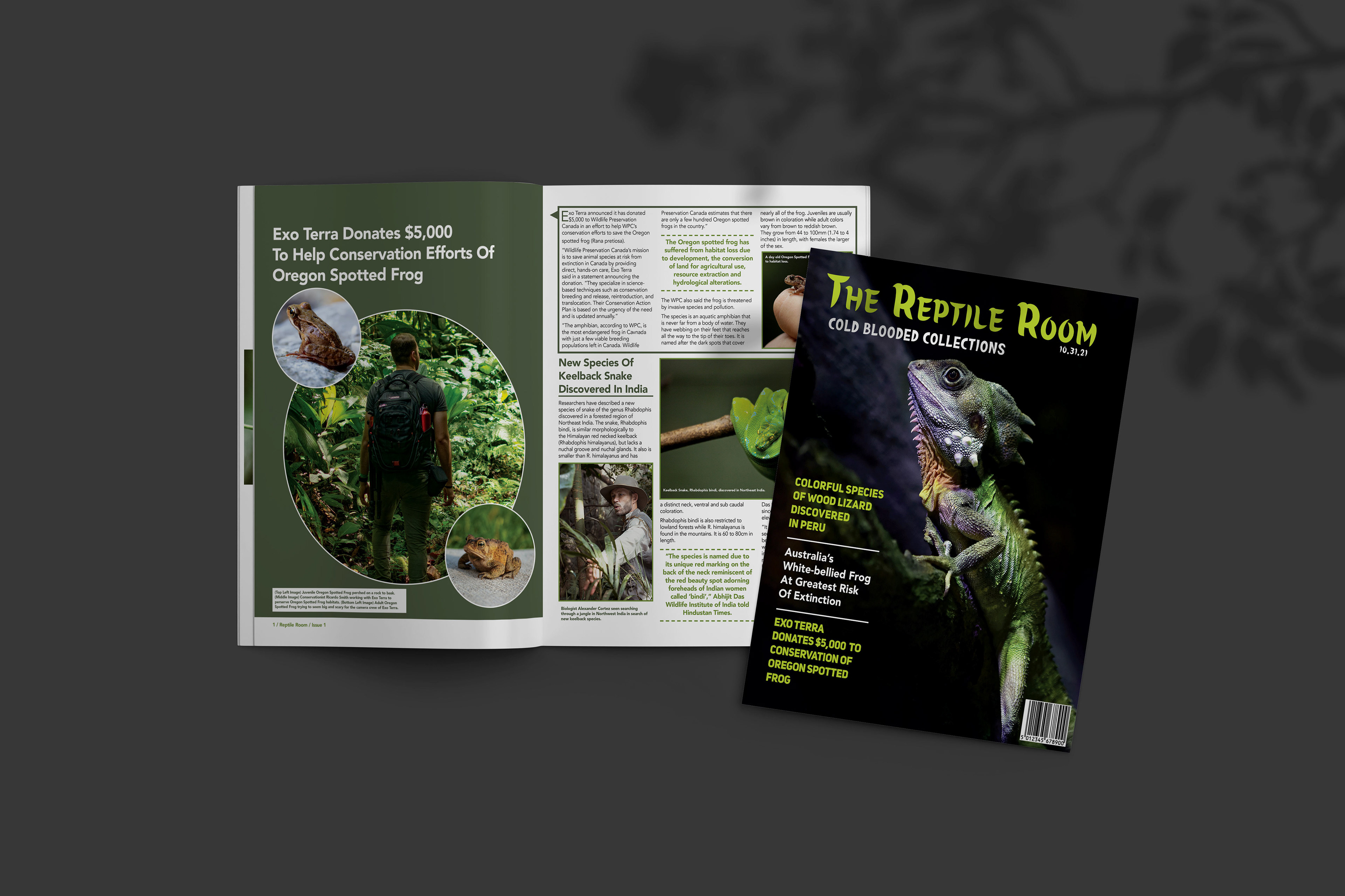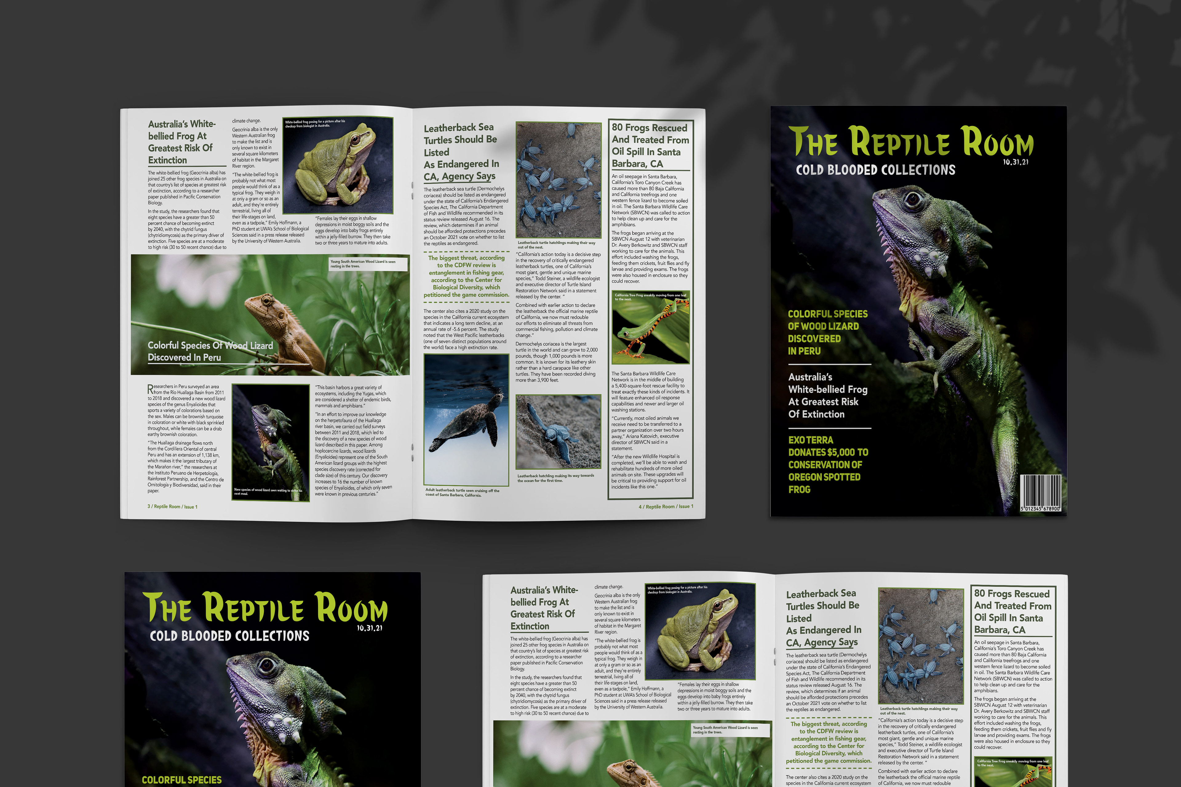 The Reptile Room is a monthly magazine for reptile enthusiasts. The magazine wanted to rework its brand identity with a new logo and magazine design. All assets for this project were created in Photoshop and InDesign.